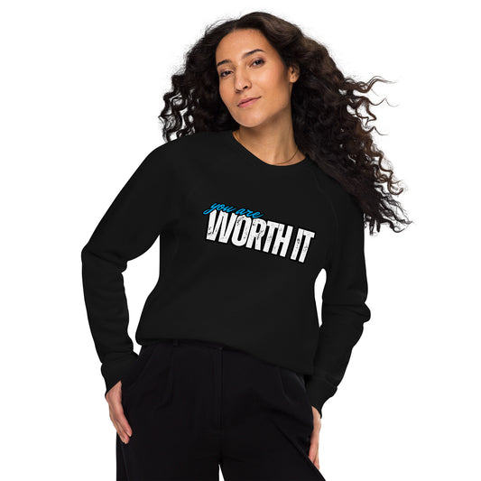 "You are WORTH IT" Unisex custom-designed organic raglan sweatshirt